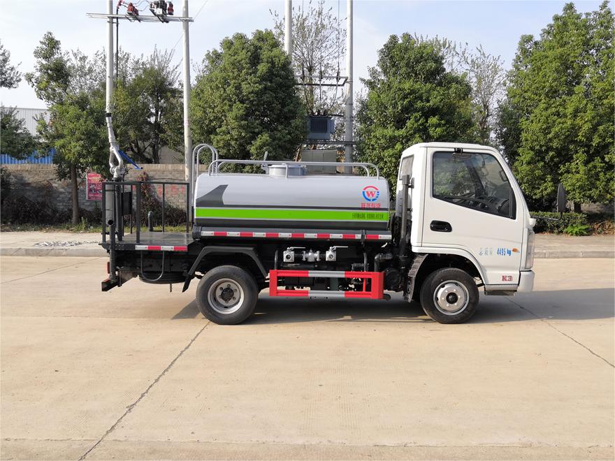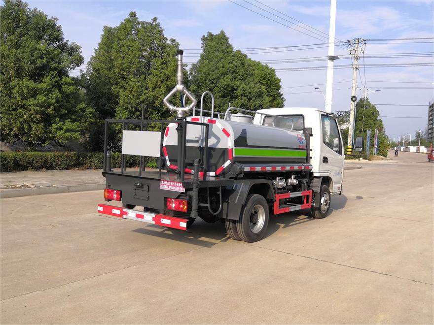 灑水車前裝有鴨形噴嘴或圓頭沖嘴,后面裝有圓柱開灑水噴嘴或蓮蓬頭噴嘴,后部有一工作平臺,裝配有水炮。后部還可裝8個噴嘴(選裝)。