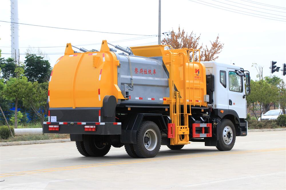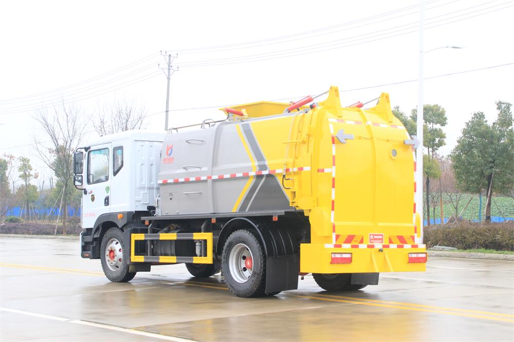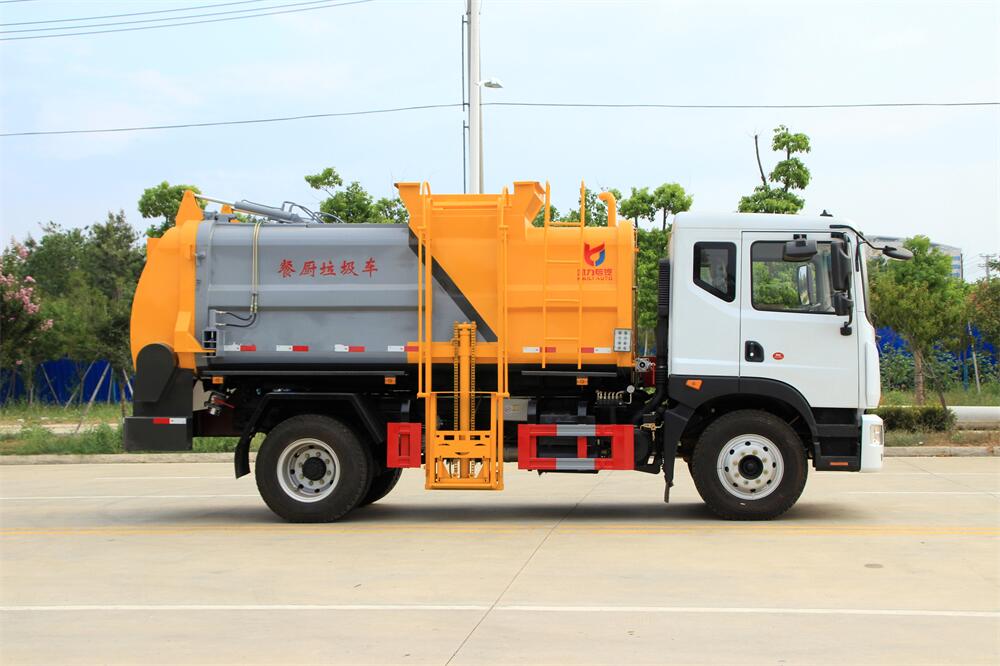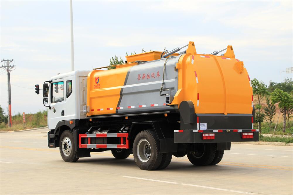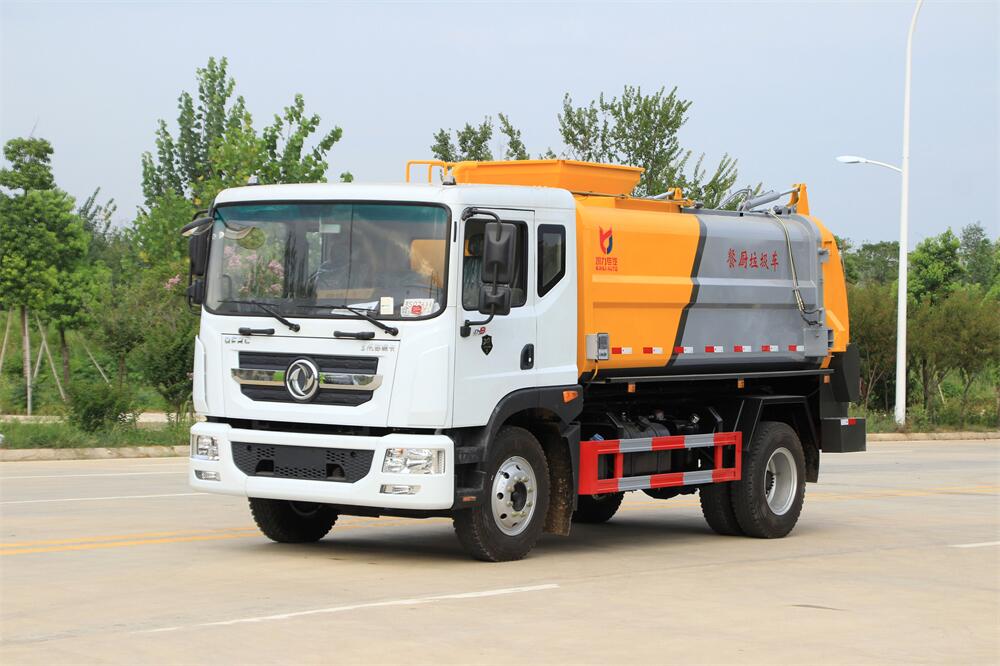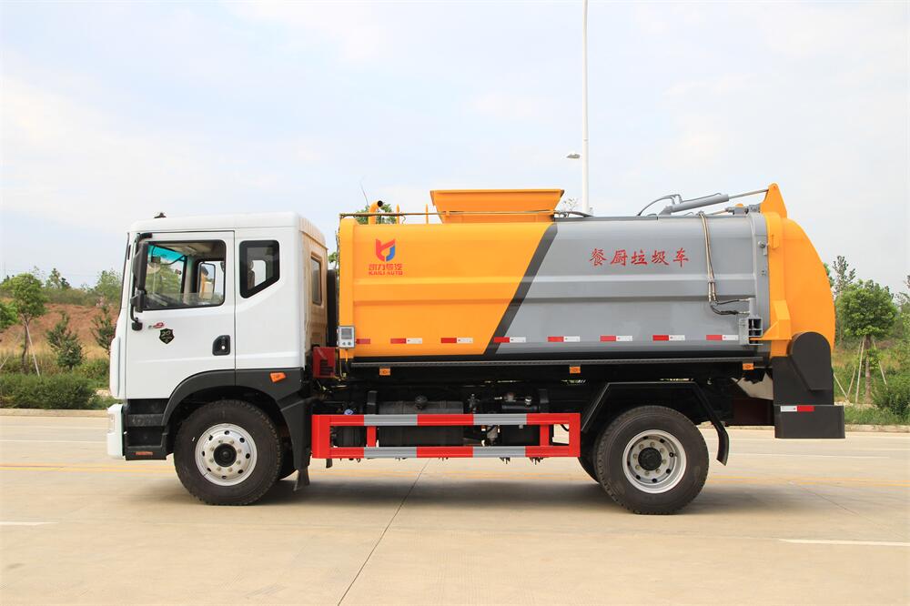 上裝配置:罐體容積10m3,配備120L/240L掛桶提升翻轉(zhuǎn)機(jī)構(gòu),液壓系統(tǒng),后蓋液壓鎖緊開啟,罐體可以舉升自卸,尾部帶自流閥;用于運(yùn)輸液態(tài)垃圾,其特點(diǎn)操作簡單,密封性好,無泄漏,無異味;可選裝固液分離功能,推板擠壓功能,常用于餐館的垃圾轉(zhuǎn)運(yùn)處理。