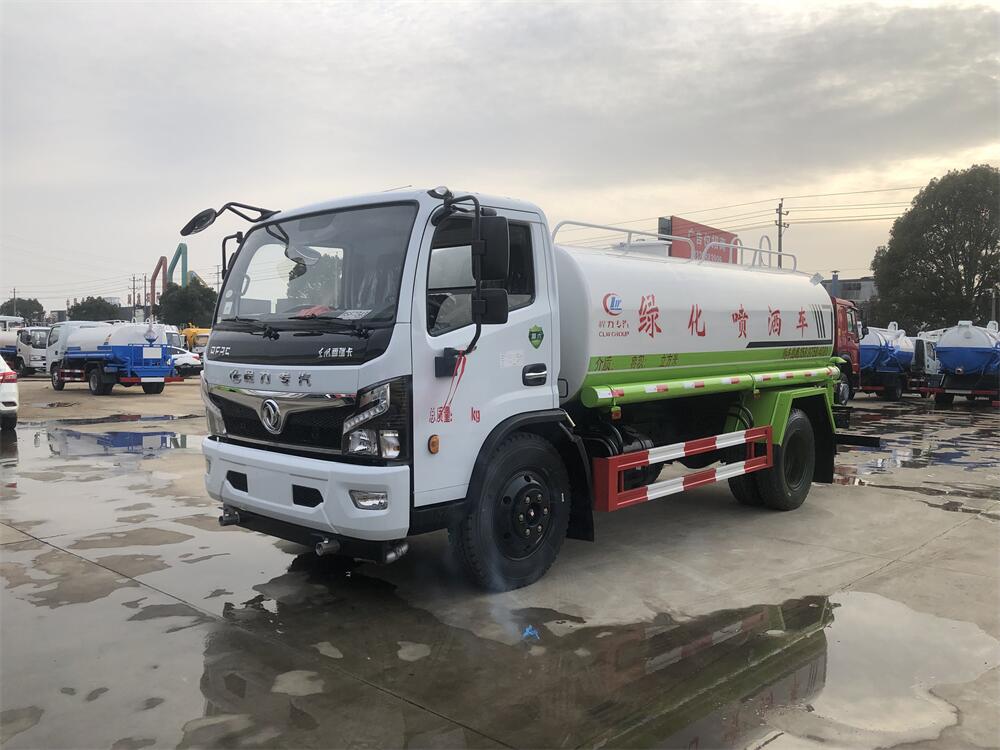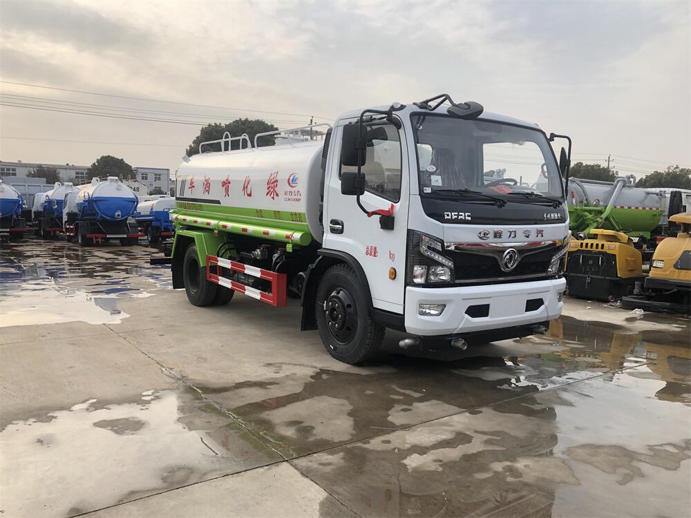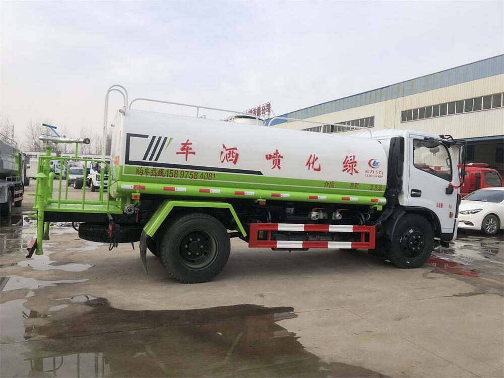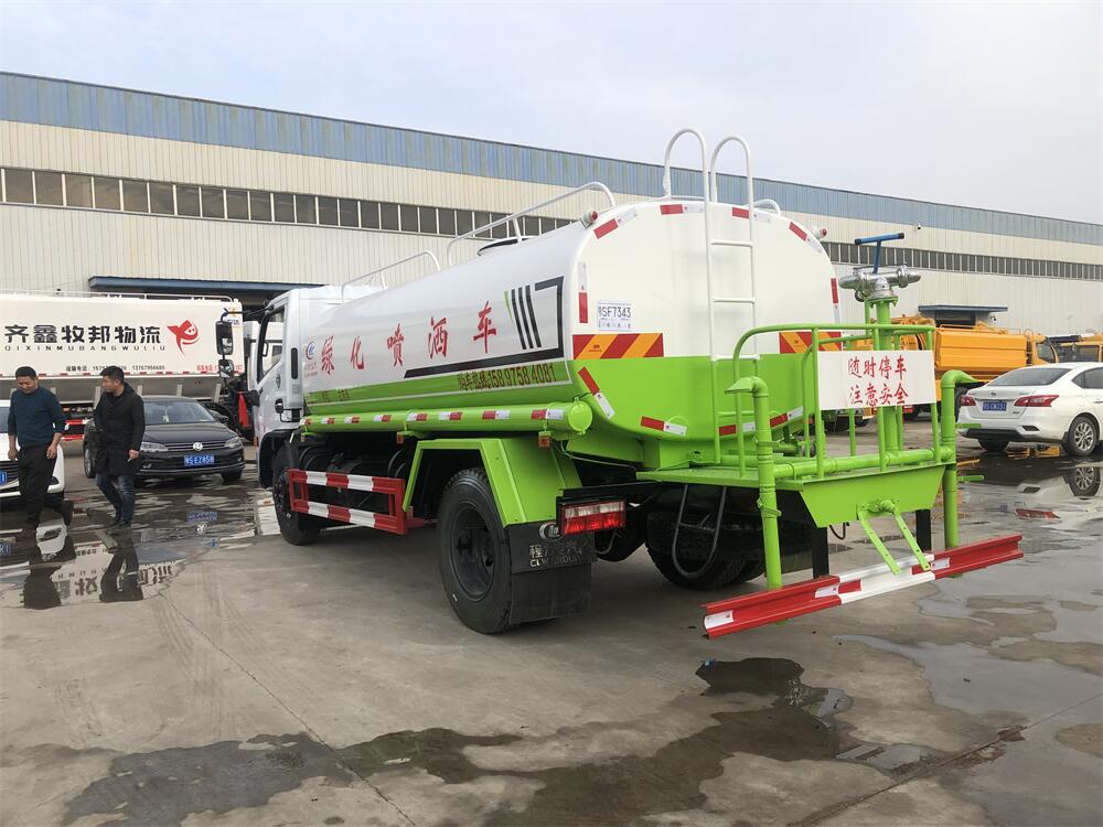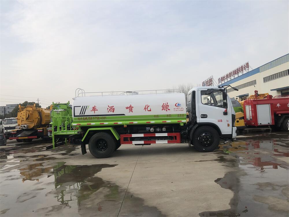 灑水車前裝有鴨形噴嘴或圓頭沖嘴,后面裝有圓柱開灑水噴嘴或蓮蓬頭噴嘴,后部有一工作平臺(tái),裝配有水炮。后部還可裝8個(gè)噴嘴(選裝)。