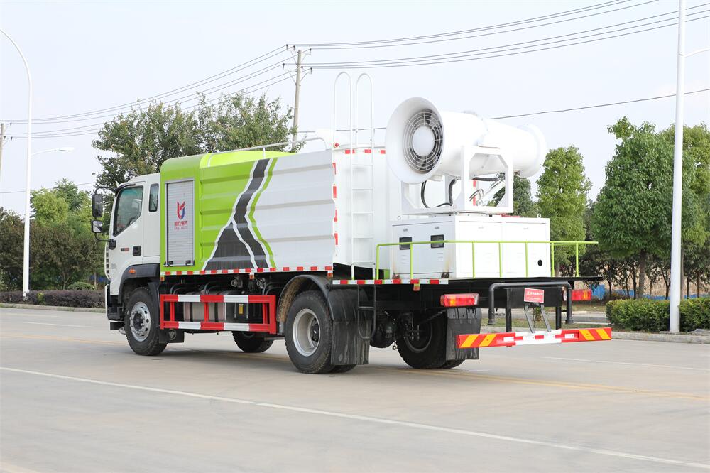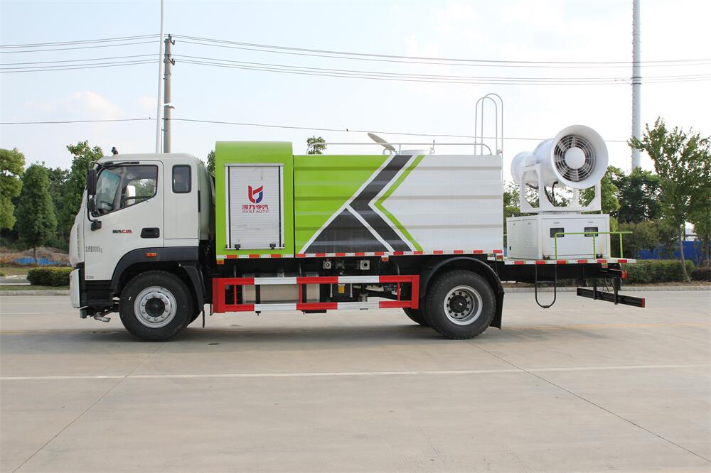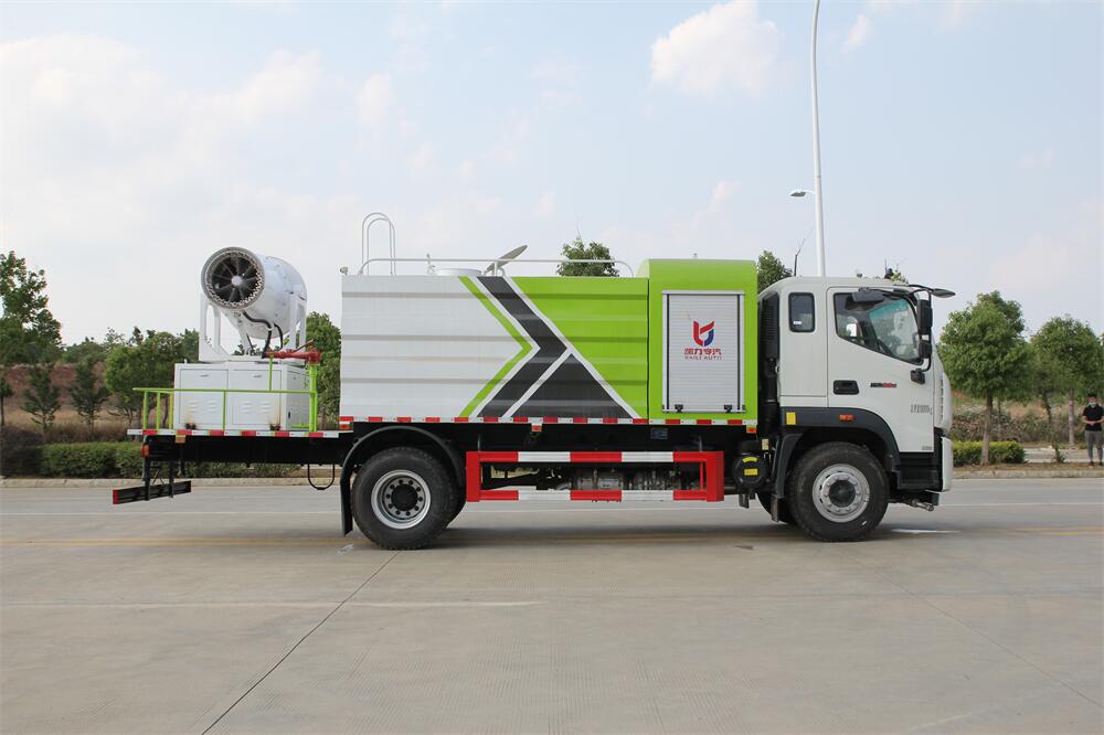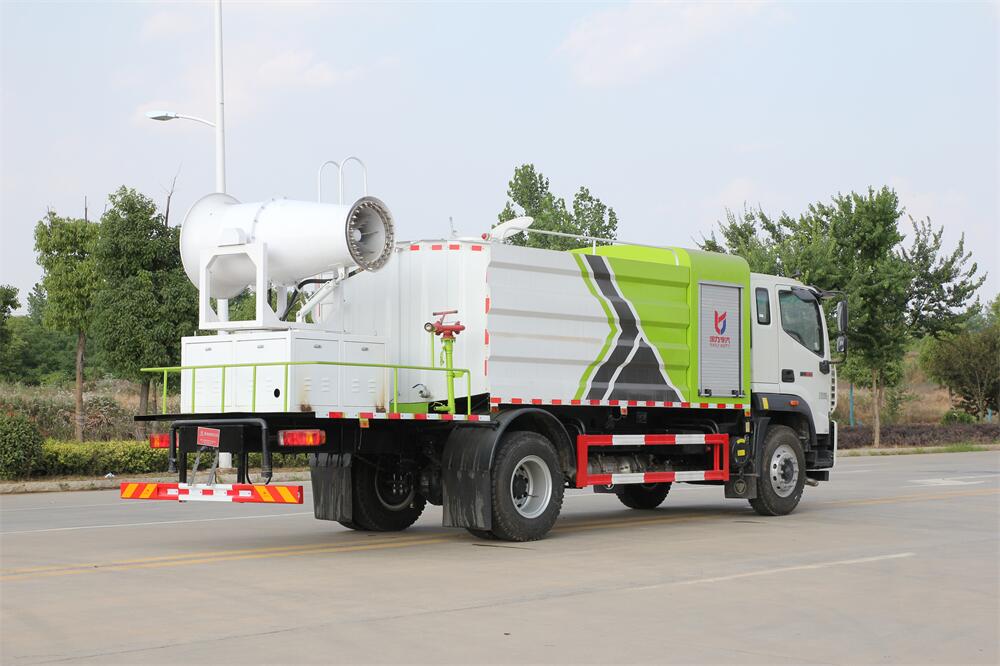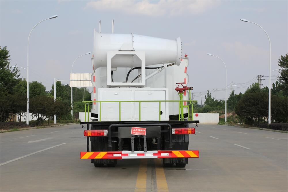 上裝配置:罐體容積為 12立方,選配風(fēng)送式霧炮機(jī)組射程30米、40米、50米、60米、80米、100米、120米霧炮,罐體鋼板為4mm碳鋼Q235材質(zhì),罐內(nèi)隔板具有防波作用,以減輕汽車行駛時(shí)罐體液體沖擊,罐體及整車外形尺寸按照公告。帶大功率專用灑水泵,泵可自吸自排,整車前沖、后灑、側(cè)噴、帶65消防接口,后平臺(tái)配CLW-50、CLW-60、CLW-80、CLW-100、CLW-120型風(fēng)送式霧炮機(jī)組;罐體前封頭配大功率柴油發(fā)電機(jī)組;前封頭帶水位計(jì),后平臺(tái)主管路帶1寸澆花接口,后爬梯。帶兩根輸水管及陰陽(yáng)端。罐體顏色:銀/灰/綠,罐體兩側(cè)噴“多功能抑塵車”字樣,貼反光標(biāo)示。