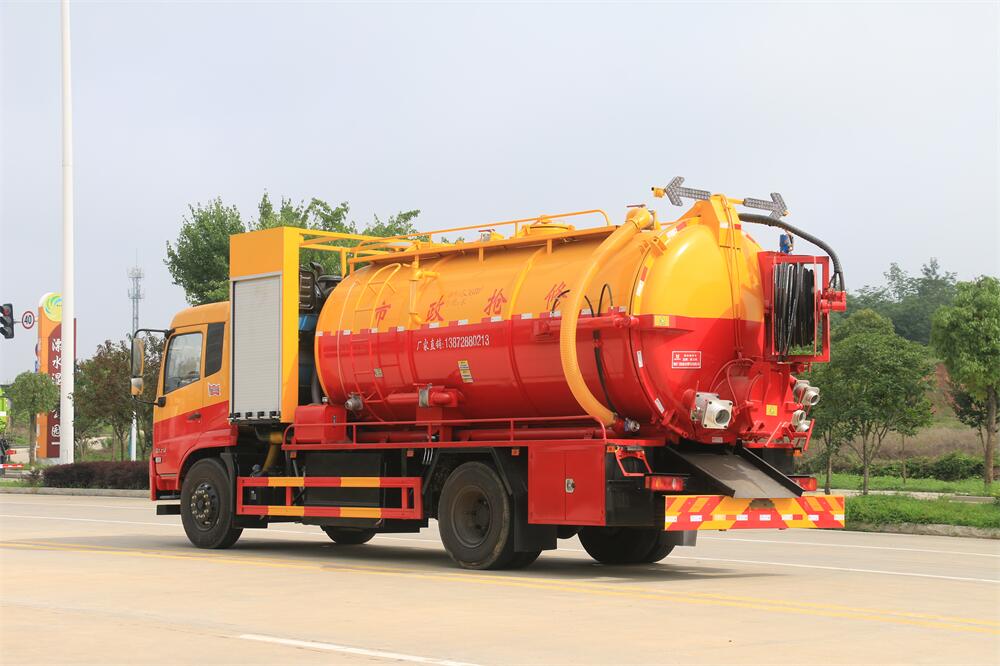 15方15方清洗吸污車-東風天錦15方10+5清洗吸污兩用車-帶副發動機圓罐紅黃色