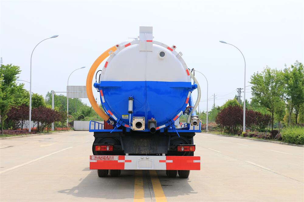 上裝配置:清水罐約 5 立方,污水罐約 10 立 方;罐體 8mm 厚,封頭 8mm 厚,水罐、污罐可 互通,用 100 球閥**開關(guān);清洗部份采用天 津通潔高壓泵,壓力 19Mpa,流量 215L/min, 配 80 米直徑 22 高壓管帶液壓卷盤;吸污部份 采用濰柴375馬力副發(fā)動(dòng)機(jī)帶山東SK-30水循 環(huán)泵(副發(fā)自帶),吸污罐帶舉升,后封頭焊 死(可選擇后封頭全開),尾部加裝一個(gè) 600mm 快開,罐體后尾部一個(gè) DN150 排污口球閥,一 個(gè) DN100 吸污球閥帶出口盤,一個(gè)視污窗,一 根 10m 吸污管,一套陰陽(yáng)端,壓力表,防溢 閥,箭頭燈,工具箱,淋管裝置,高壓泵帶氣 吹水。配一個(gè) 4.5 公斤水雷噴頭,另帶一個(gè) 80 公分手持洗車噴頭。