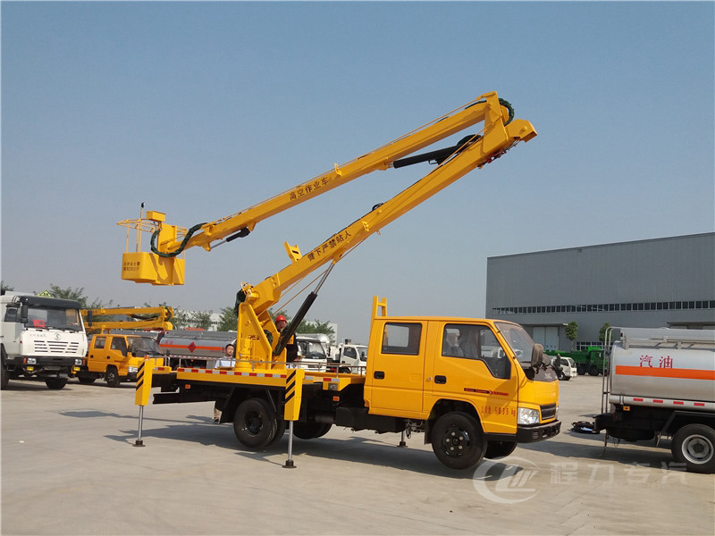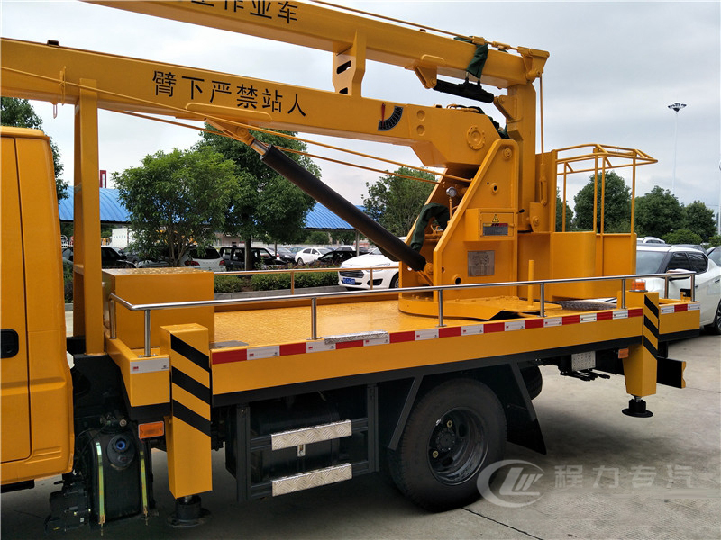 其他 | 該車前伸為800mm。選裝二節工作臂時,作業高度為12米; 選裝三節工作臂時,作業高度為14米和16米。防護材料:Q23**碳鋼,連接方式:左右側面及后下部防護均采用焊接連接,后部防護斷面尺寸(mm):170×50,后部防護離地高度(mm):350。ABS系統型號:APG3550500A,ABS系統生產廠家:浙江亞太機電股份有限公司。該車可選裝帶電控操作箱。專用裝置:吊臂,主要用于高空作業,進行維修、安裝、清洗、攝影、造船、化工、電力、剪枝、更換路燈及其他工程搶修作業。 |
