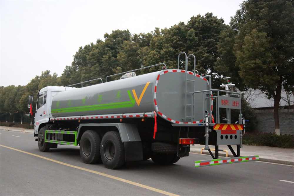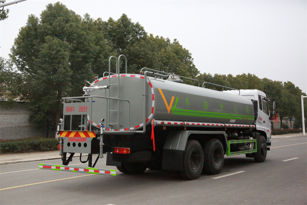 灑水車前裝有鴨形噴嘴或圓頭沖嘴,后面裝有圓柱開灑水噴嘴或蓮蓬頭噴嘴,后部有一工作平臺(tái),裝配有水炮。后部還可裝8個(gè)噴嘴(選裝)。